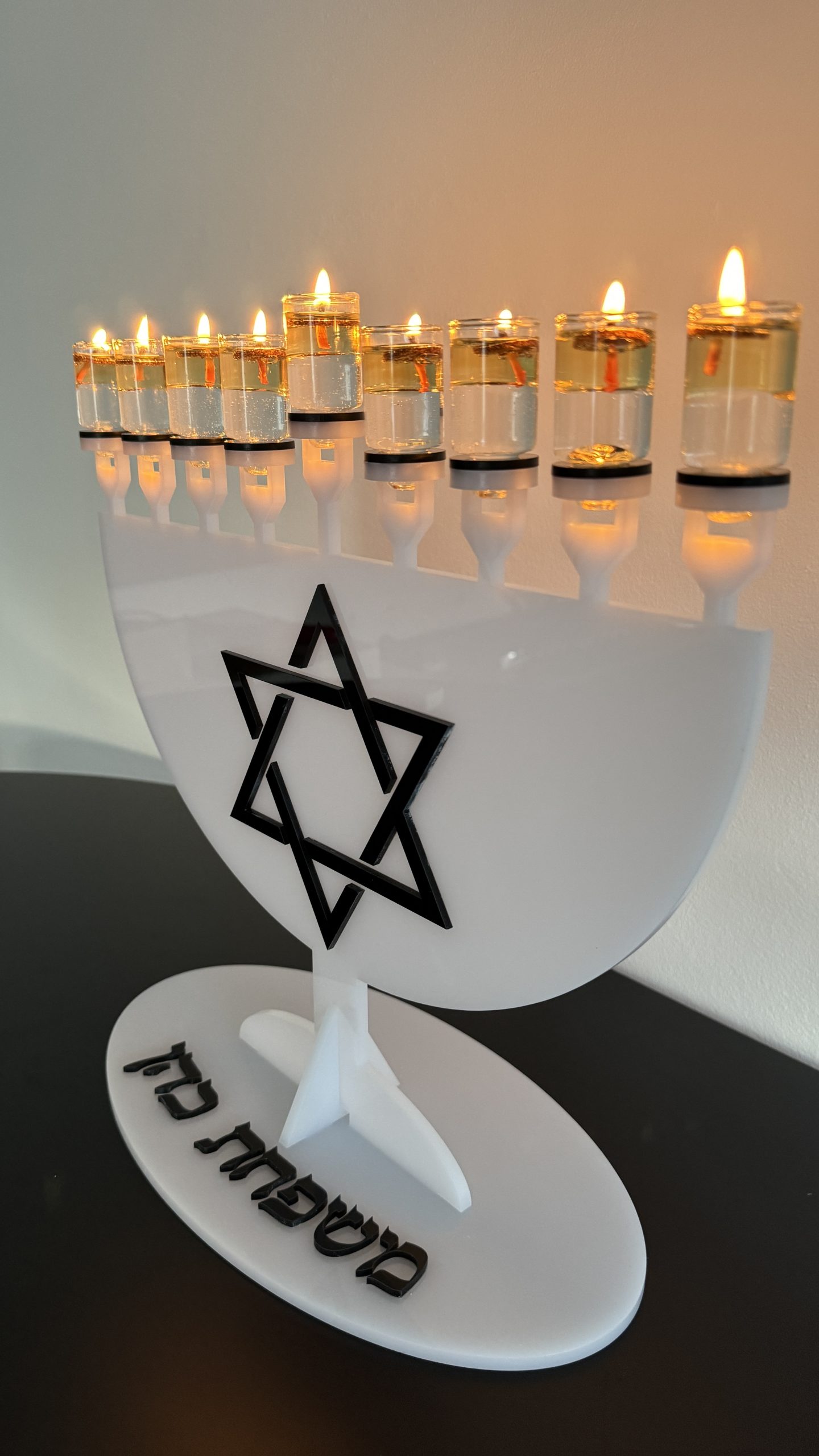 חנוכית אקריל לבנה + שם משפחה ומגן דוד שחור מבריק