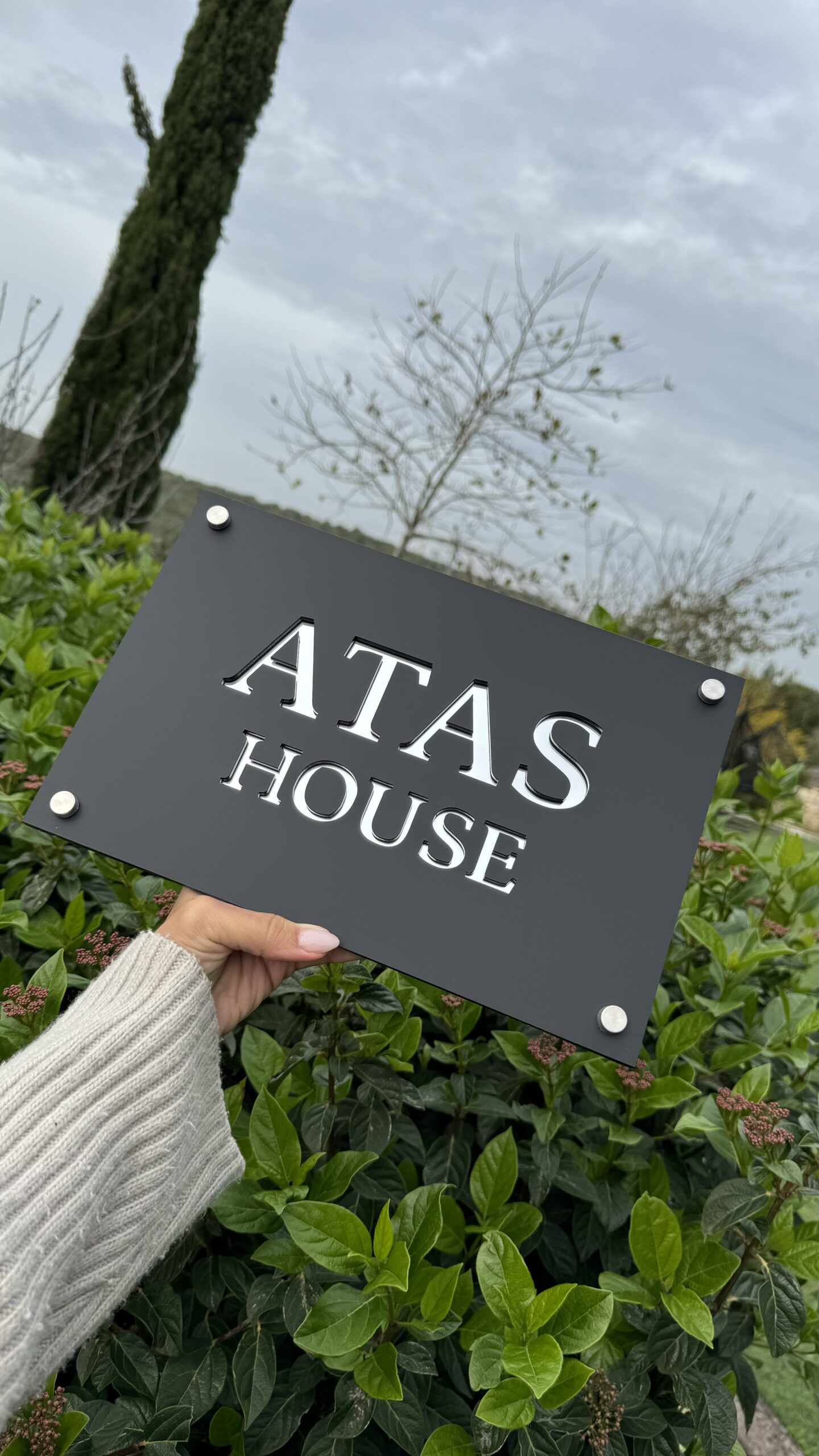 שלט שחור בשילוב אותיות בכסף מראה הכולל 4 ברגים להתקנה על קיר